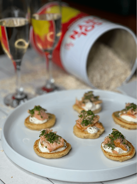 Server de lune blinis med creme fraiche, varmrøget laks og hakket purløg.
