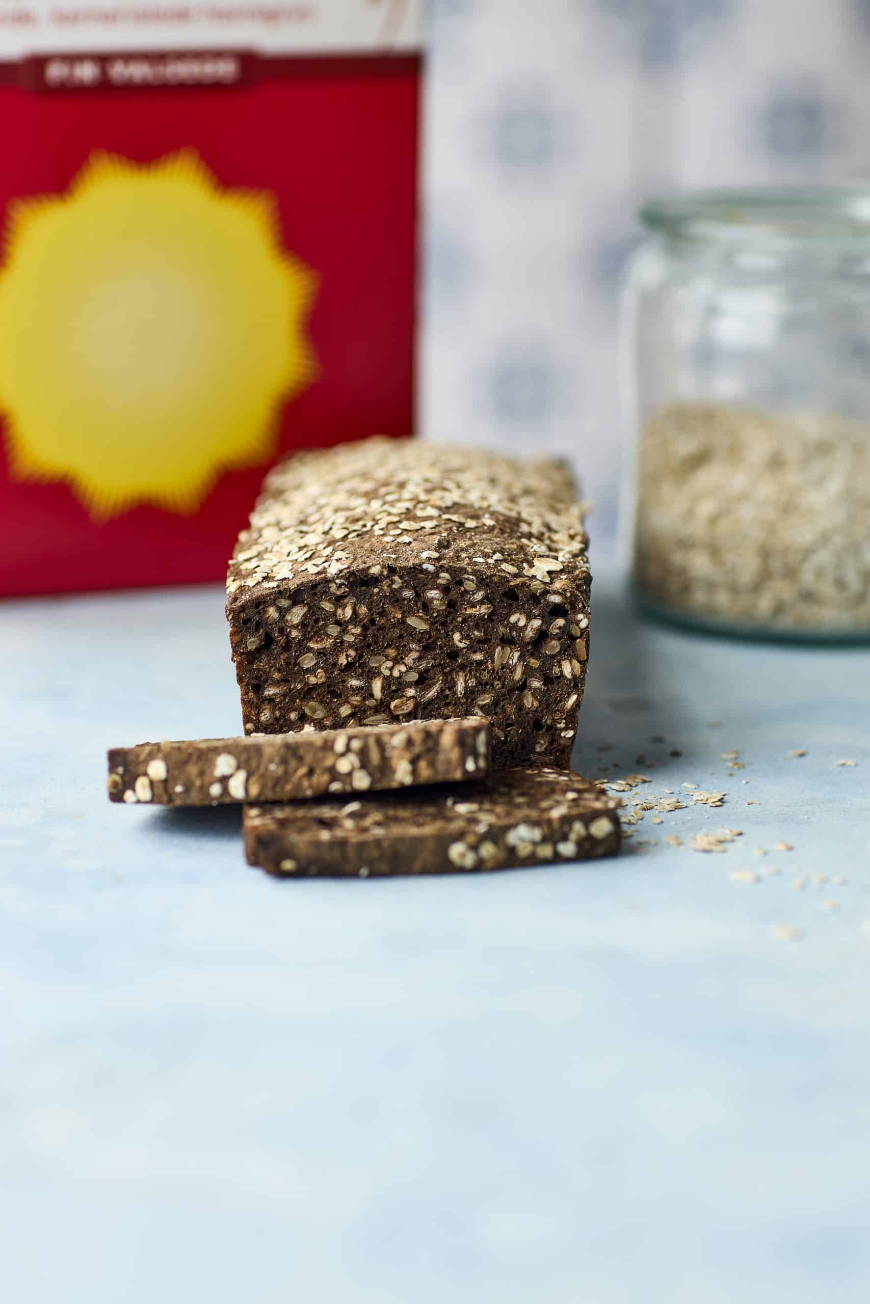 Smør rugbrødsformen og hæld dejen i. Glat overfladen med en fugtig ske og drys havregryn på toppen.